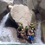 Damit uns nicht kalt wird ziehen wir uns nun Neoprenanzug, Helm und Schwimmweste an und erobern die letzten 800m des nun engen Canyon schwimmend und zu Fuss. Am Ende der Schlucht wo wir nicht mehr weiterkommen grüßt uns ein wunderschöner Wasserfall. Hier können wir rutschen, ins Wasser springen und die außergewöhnliche Stimmung das Canyon genießen bevor wir wieder zurück gehen. Wieder Trockenen Fusses laufen wir nun am Fluss zurück auf einer anderen Route zu unserem Landrover.