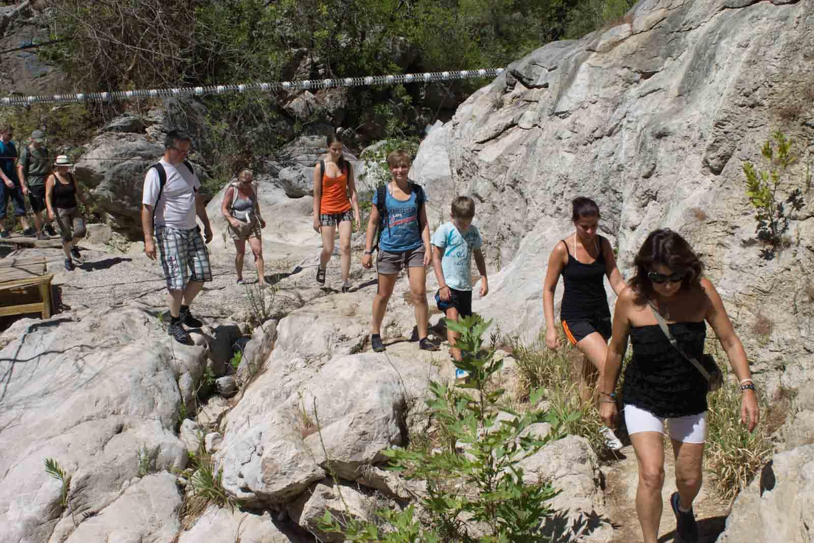 Am Anfang der Schlucht haben wir schon eine Bademöglichkeit und steigen über den versteckten Lykischen Pfad immer weiter in den Canyon. Die Berge erscheinen uns zum Greifen nahe, die Felsen verschließen uns den weiteren Zugang zum Tal und wir steigen abwärts zum Fluss, der hier nun wieder mehr Wasser hat.